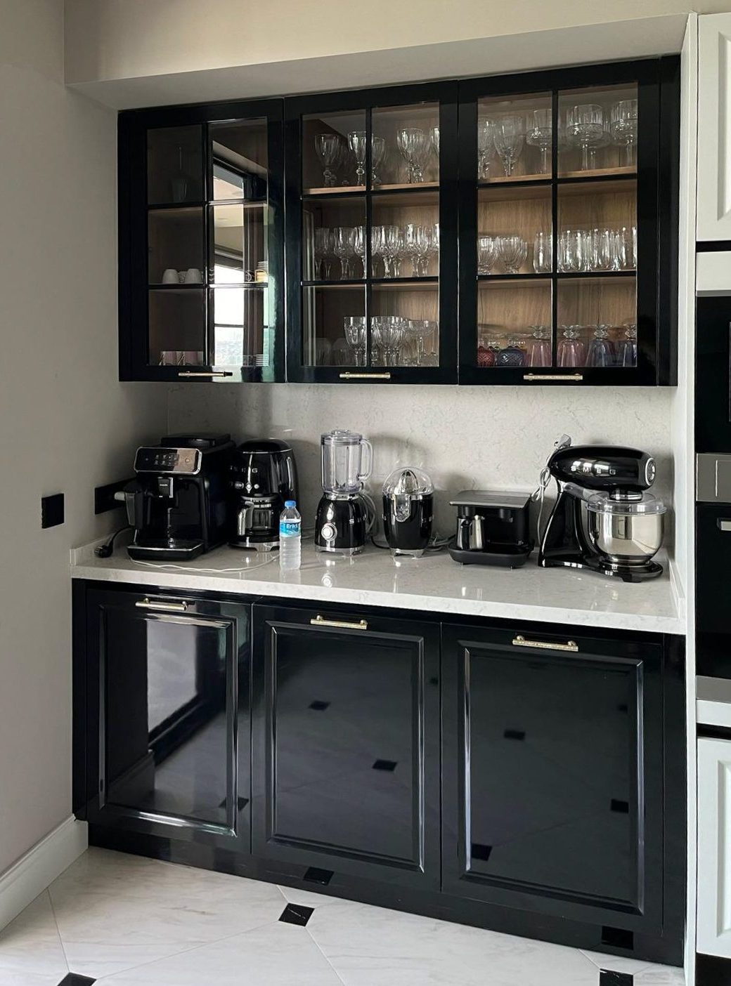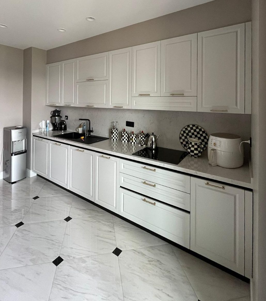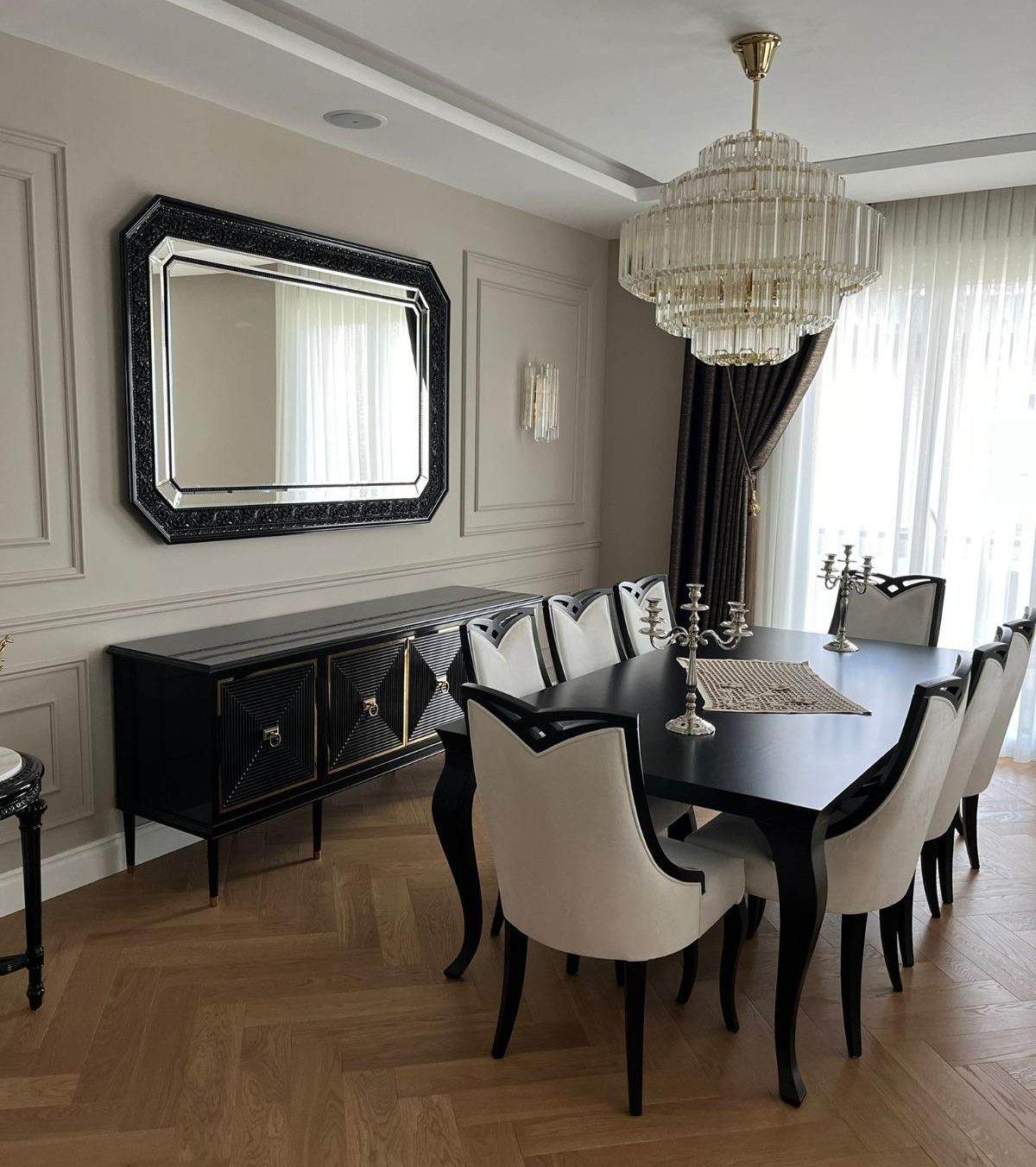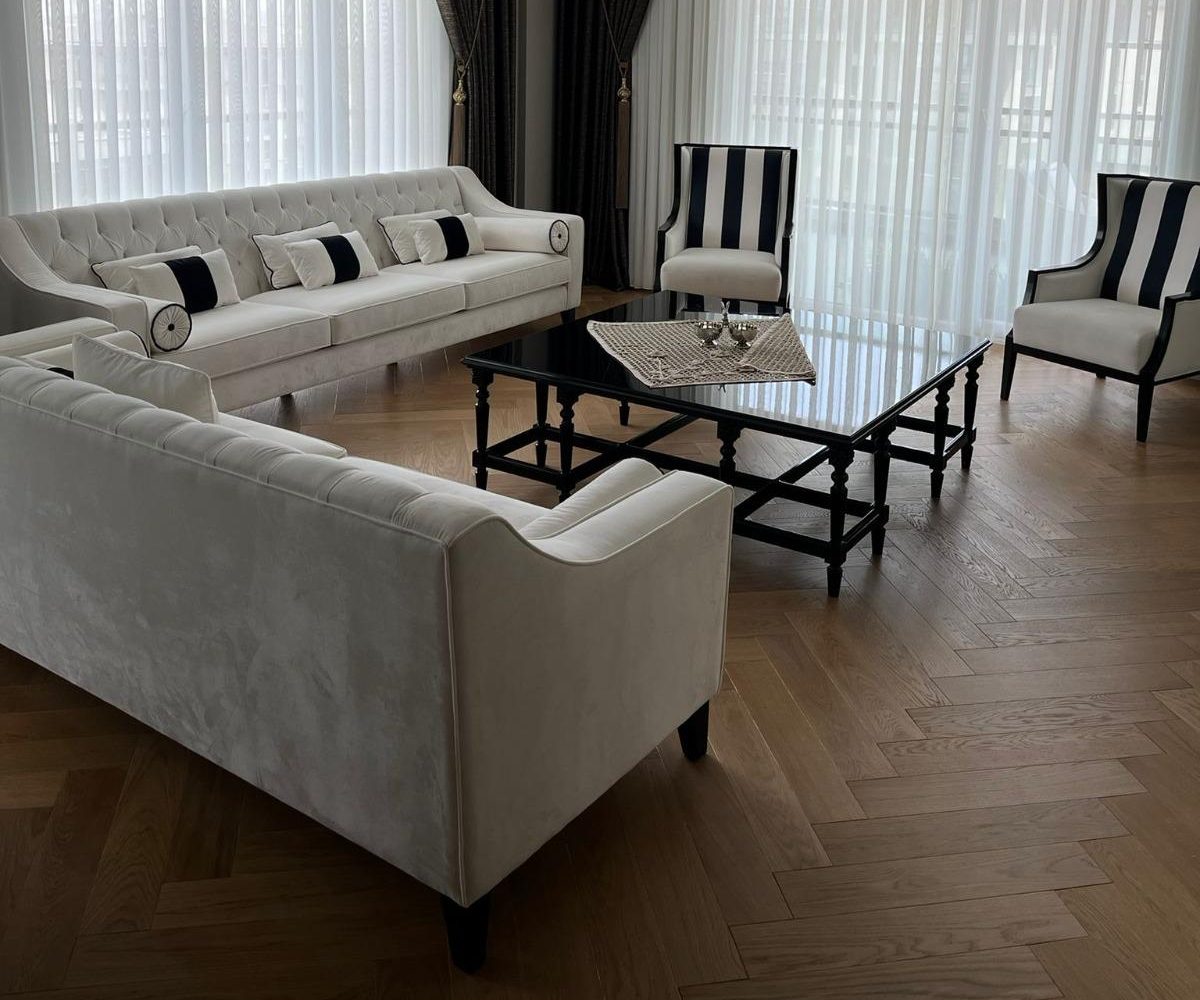 This living space reinterprets classical elements with modern lines. The black-and-white contrast — visible in furniture and drapery — adds bold character, while light-toned upholstery and abundant daylight provide balance. Ceiling details and wall framing preserve classical references, while contemporary furniture creates a timeless ambiance. The herringbone wooden flooring adds warmth and depth, enhancing the spatial richness through texture and material layering.